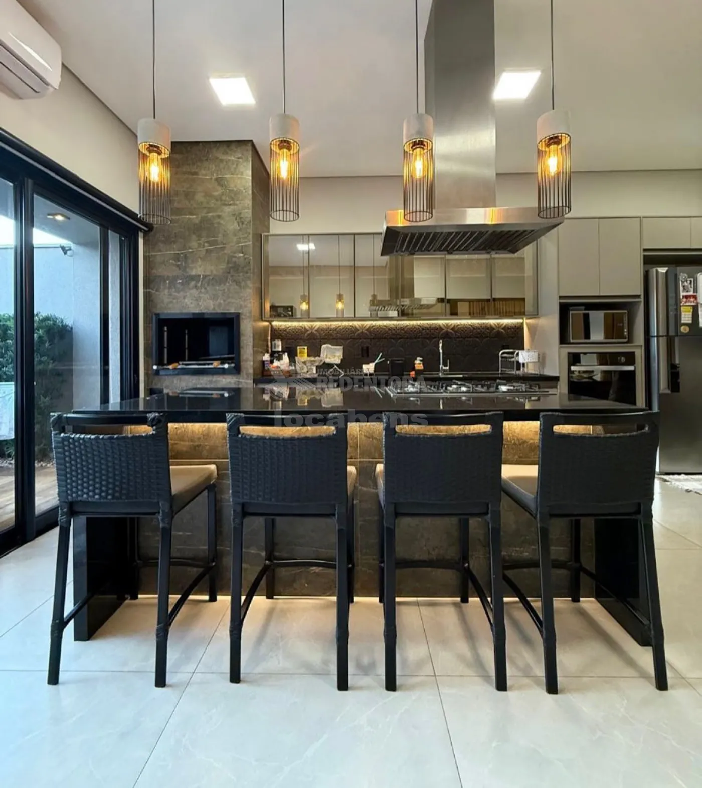 - Cozinha gourmet planejada com ar-condicionado e balcão refrigerado