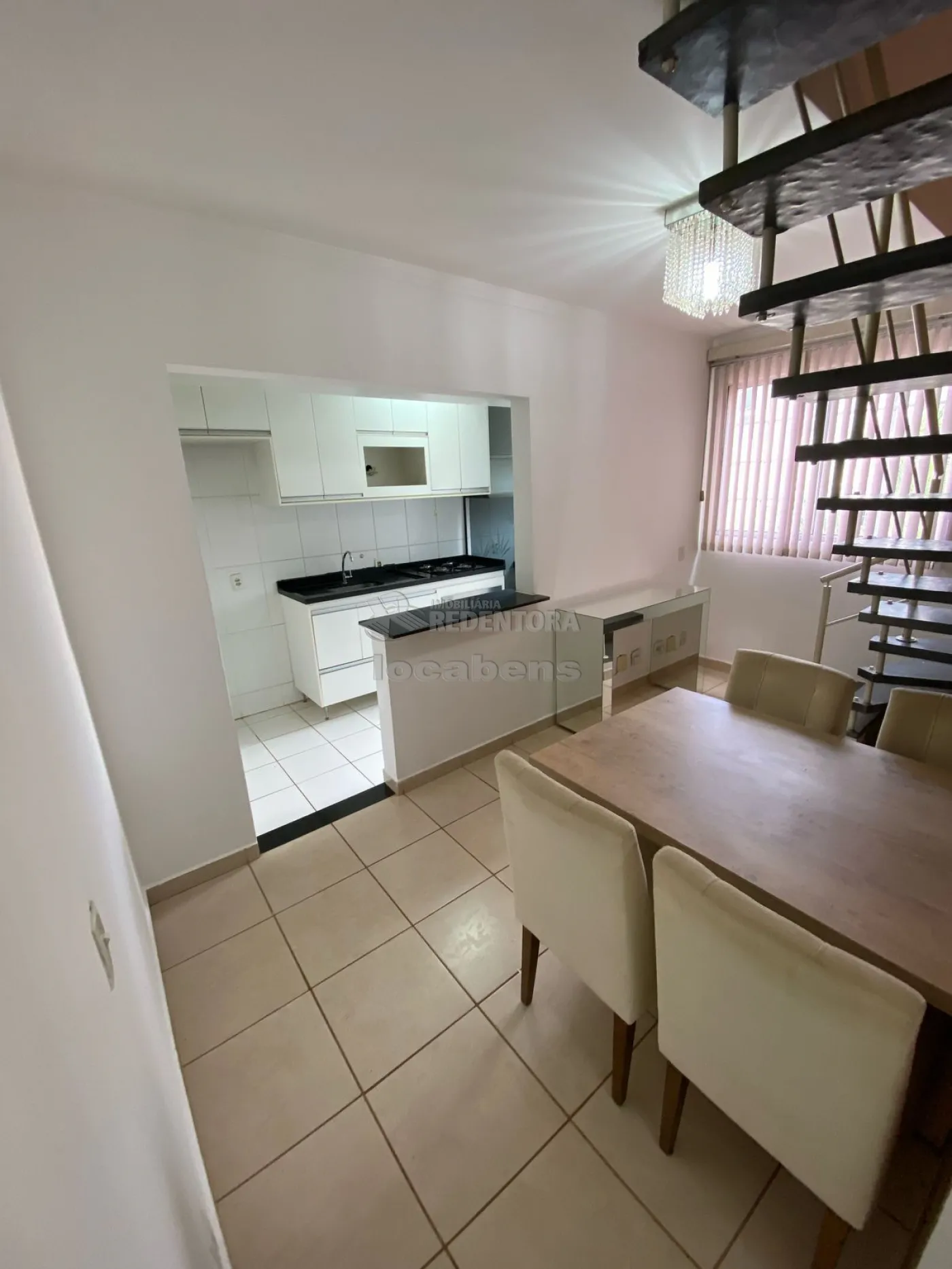 sala de jantar com mesa, cadeiras, aparador, persiana e lustre