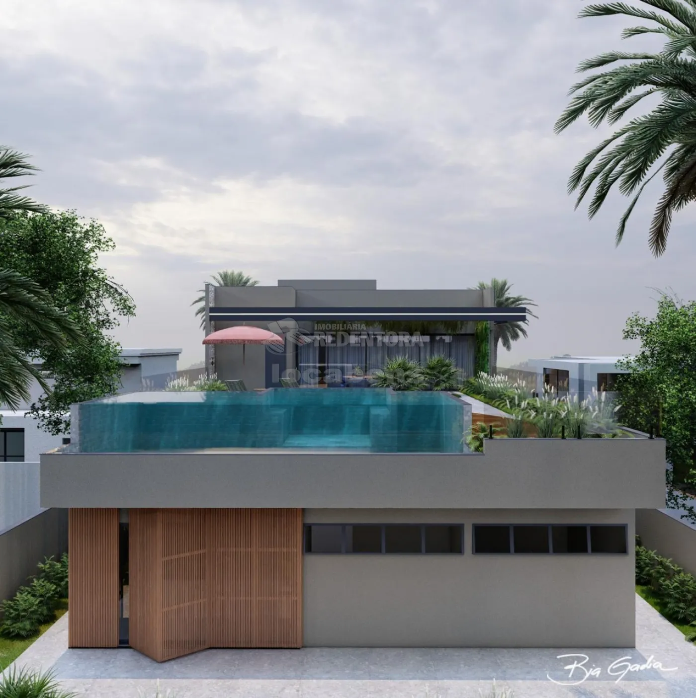 Piso superior com 1 suíte com sacada, varanda gourmet de 100m² com churrasqueira, 2 banheiros (feminino e masculino), terraço, fire place, piscina com borda infinita com vista para o campo de golfe.