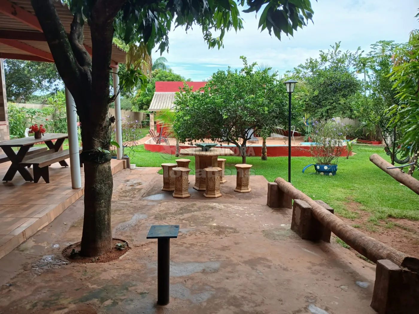 Garagem para 06 carros cobertos, piscina, área verde com vários pés de frutas.